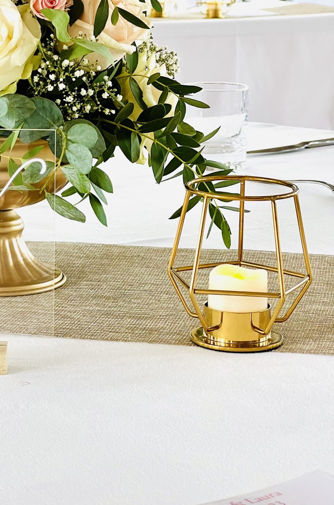 Leur décor doré métallique, associé au verre du bougeoir, permet à la bougie (à louer et à associer spécifiquement avec des bougies LED) de briller de manière élégante, en apportant une touche sophistiquée.
